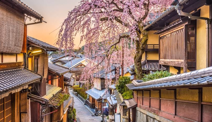 A unique blend of ancient traditions and cutting-edge technology, with cherry blossoms and temples.